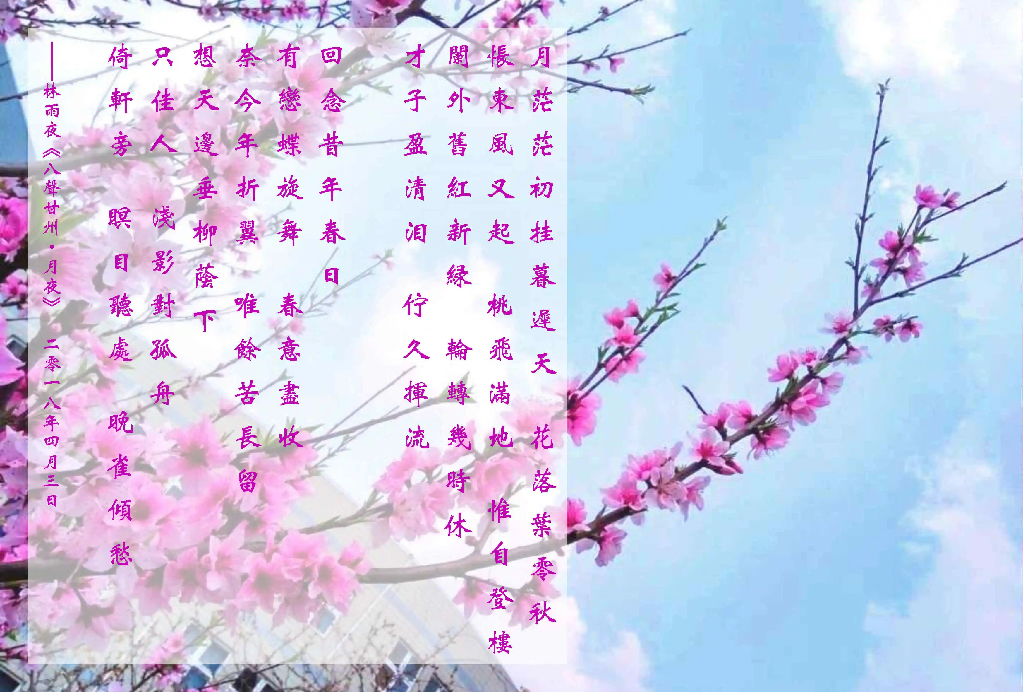 暗想昔时岁景,也行经暮雨,怜取朝烟。怕迷踪总似,日日复年年。最难忘,浮光在眼,也未如,人海一凭肩。微垂首,繁樱缀满,含露清圆。