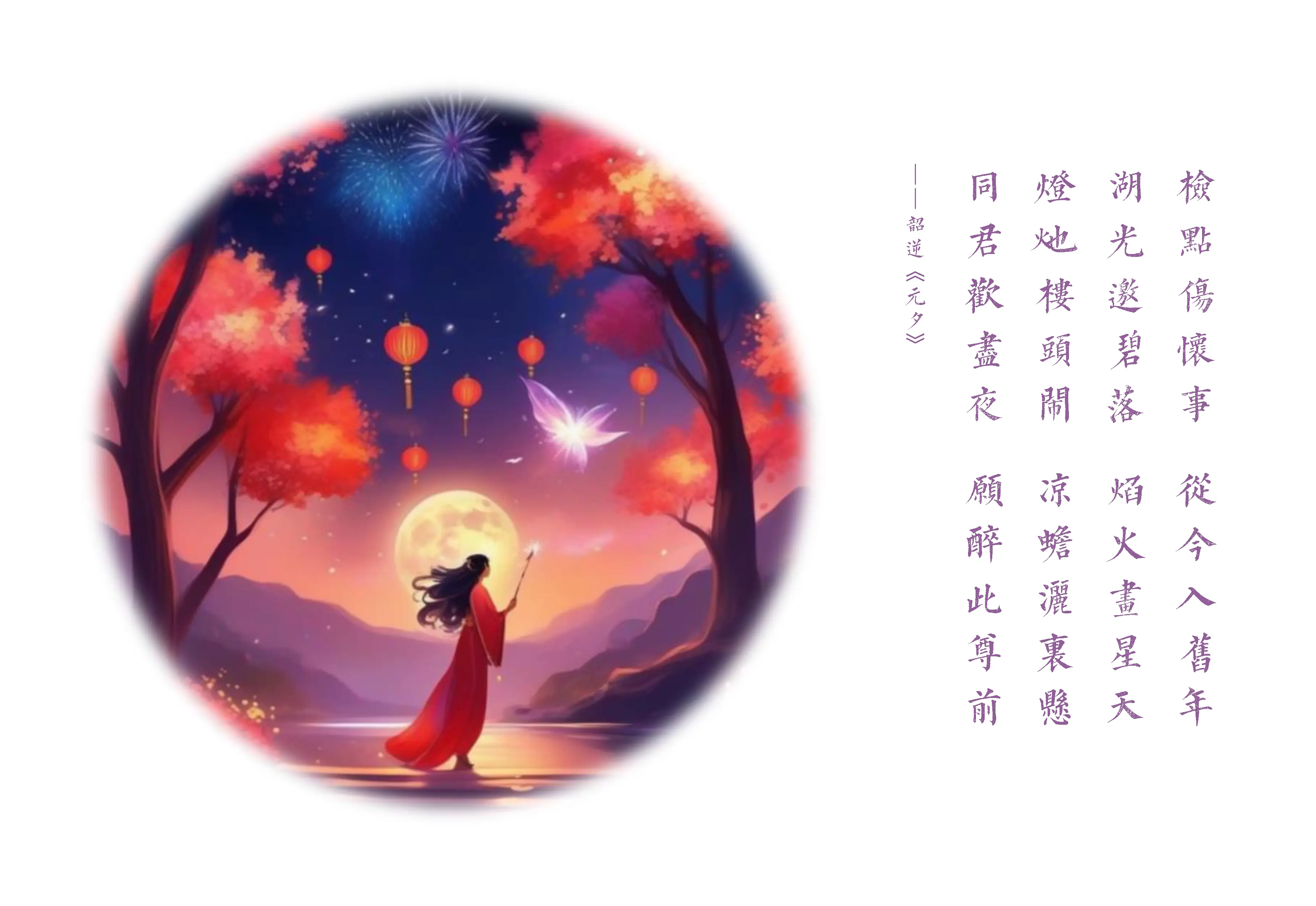 硝焰迸如钱。此夕难眠。醉将红烛忆貂蝉。云鬓香匀仙袂举,拥上灯船。